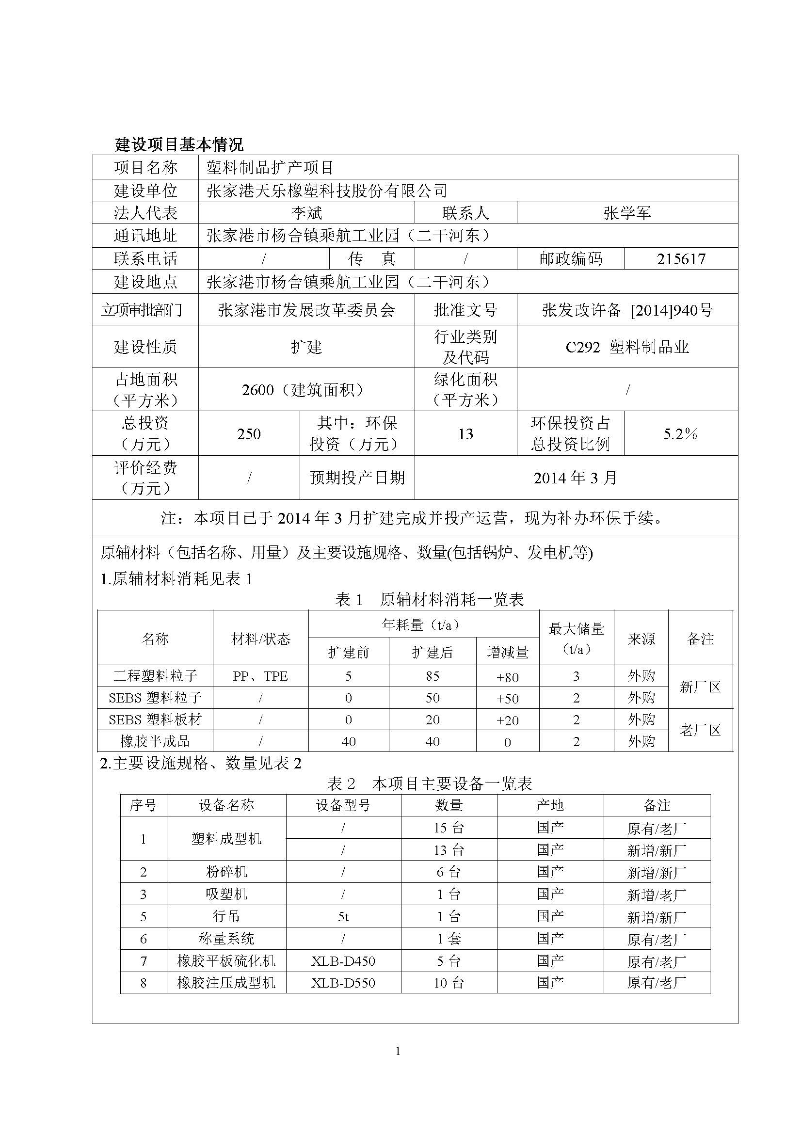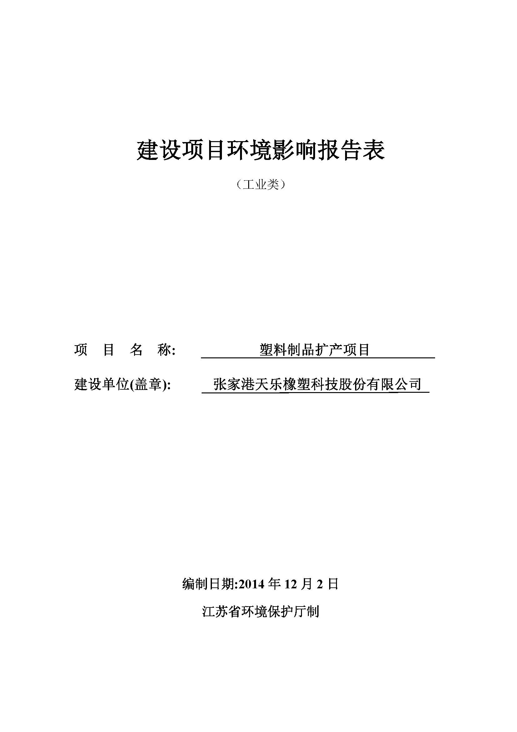 张家港天乐橡塑科技股份有限公司 塑料制品扩产项目 公示
